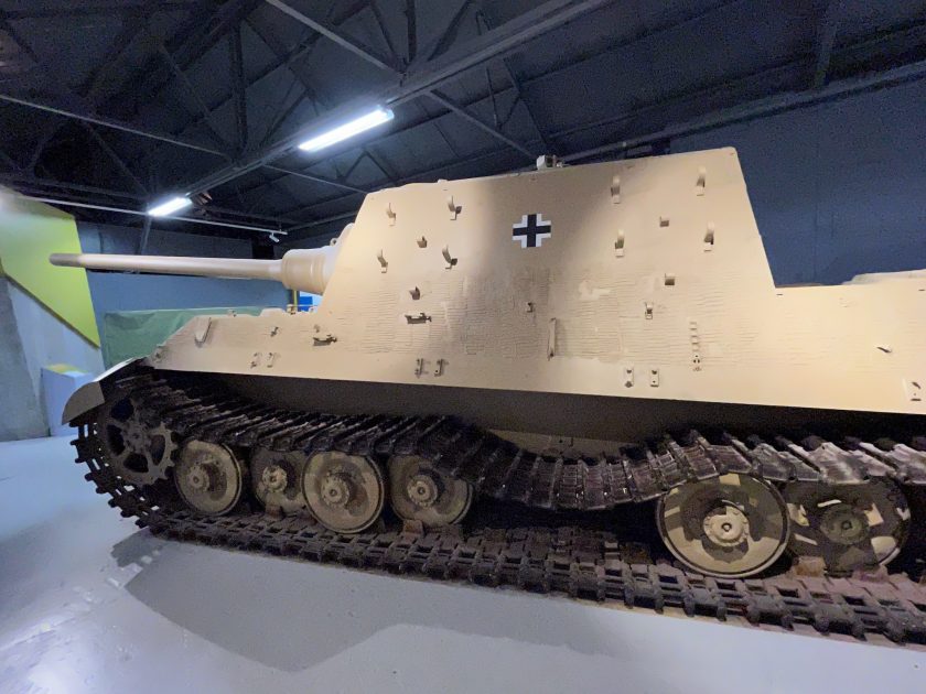 After being tested at Sennelager it was sent to the School of Tank Technology at Chertsey in the UK before arriving at the Tank Museum in 1952. It is missing its rear engine plate cover, its third suspension unit and two road wheels on its left hand side but still retains its original Zimmerit anti-magnetic mine paste.