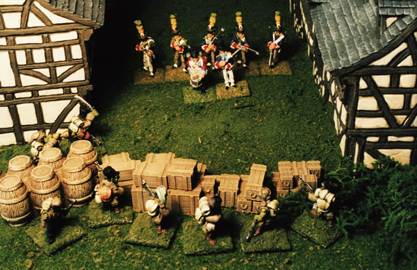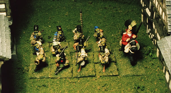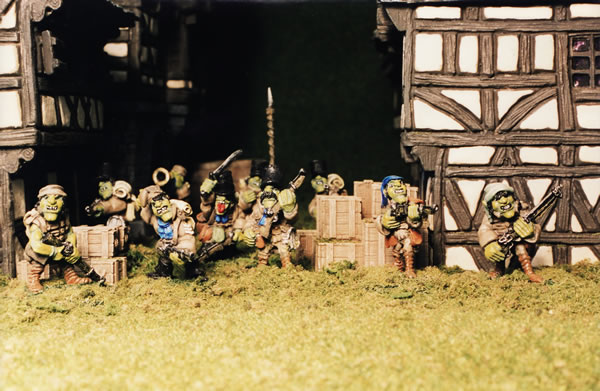 Flintloque Orc Rifles enter a village to see if there are any Elves hiding in the shadows.