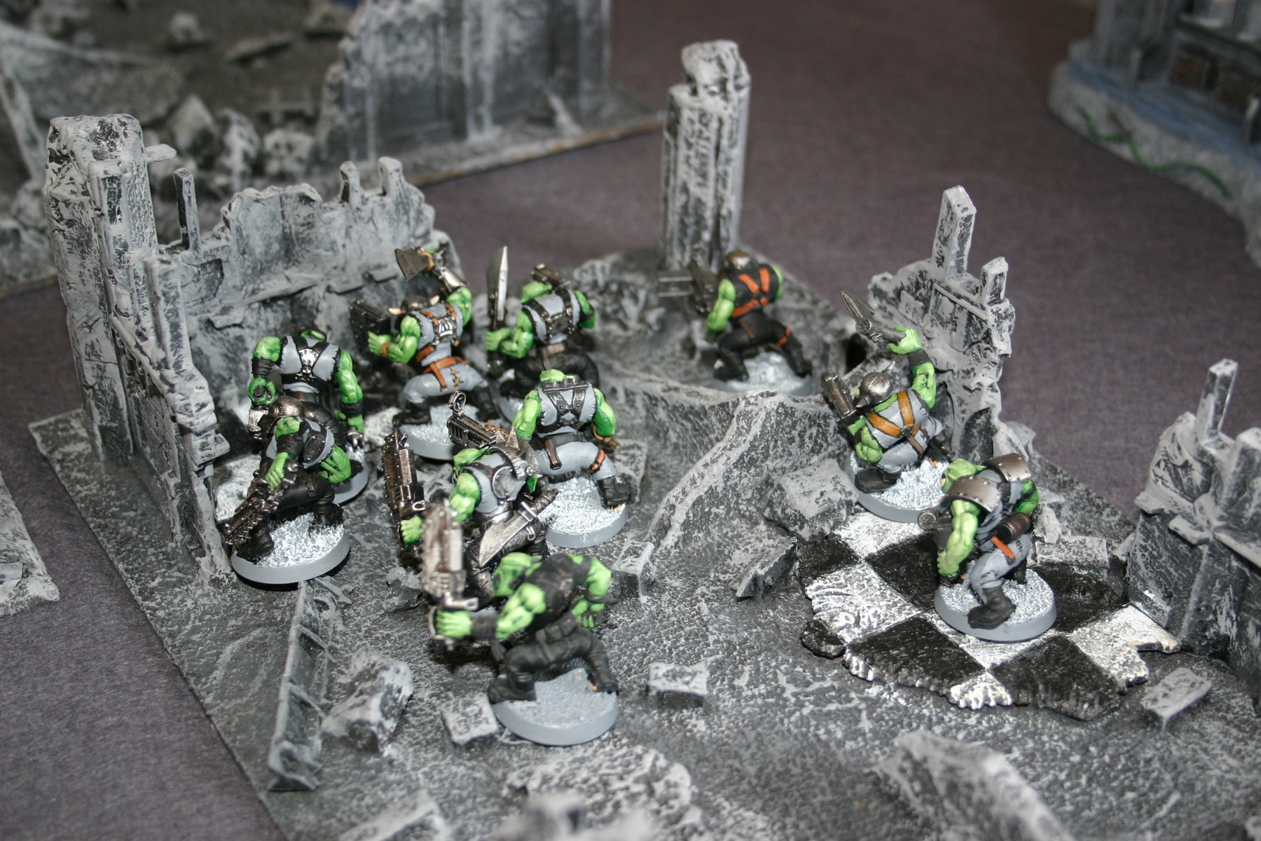 Ork Boyz from my Ork army moving across the battlefield, a ruined Imperial city.