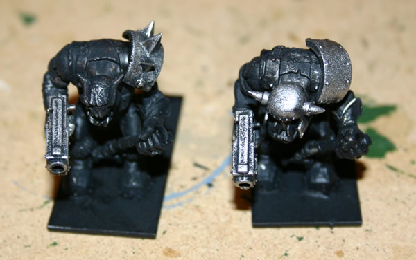 I start off with a black undercoat and then do all the metallic bitz with a drybrush of tin bitz and chainmail.