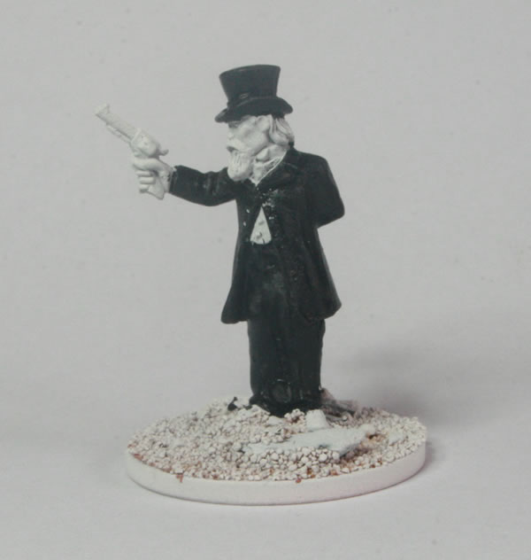 I used Citadel sand on the base, before giving the model a white undercoat. I then painted his suit and top hat with black paint.