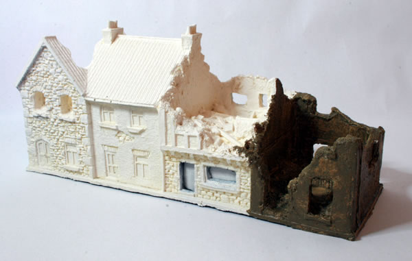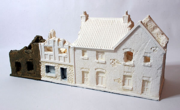 I have the ruined row of three houses and the ruined row of four houses, from Total Battle Miniatures. Having cleaned the models, I gave the inside of the models a black undercoat and then masked the inside of the windows (with masking tape) before I give the model a white undercoat on the outer side of the model.