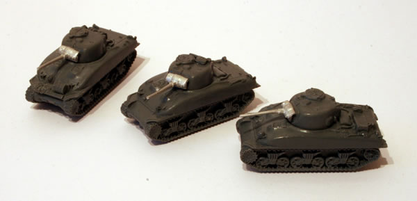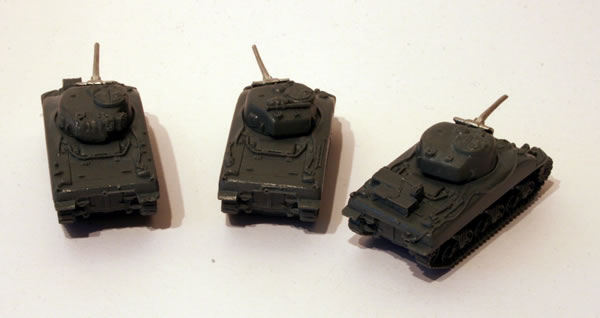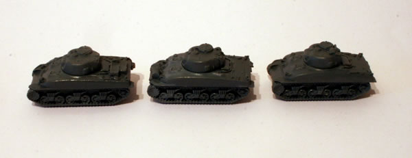 These Sherman tank miniatures come in the Open Fire Flames of War starter set.
