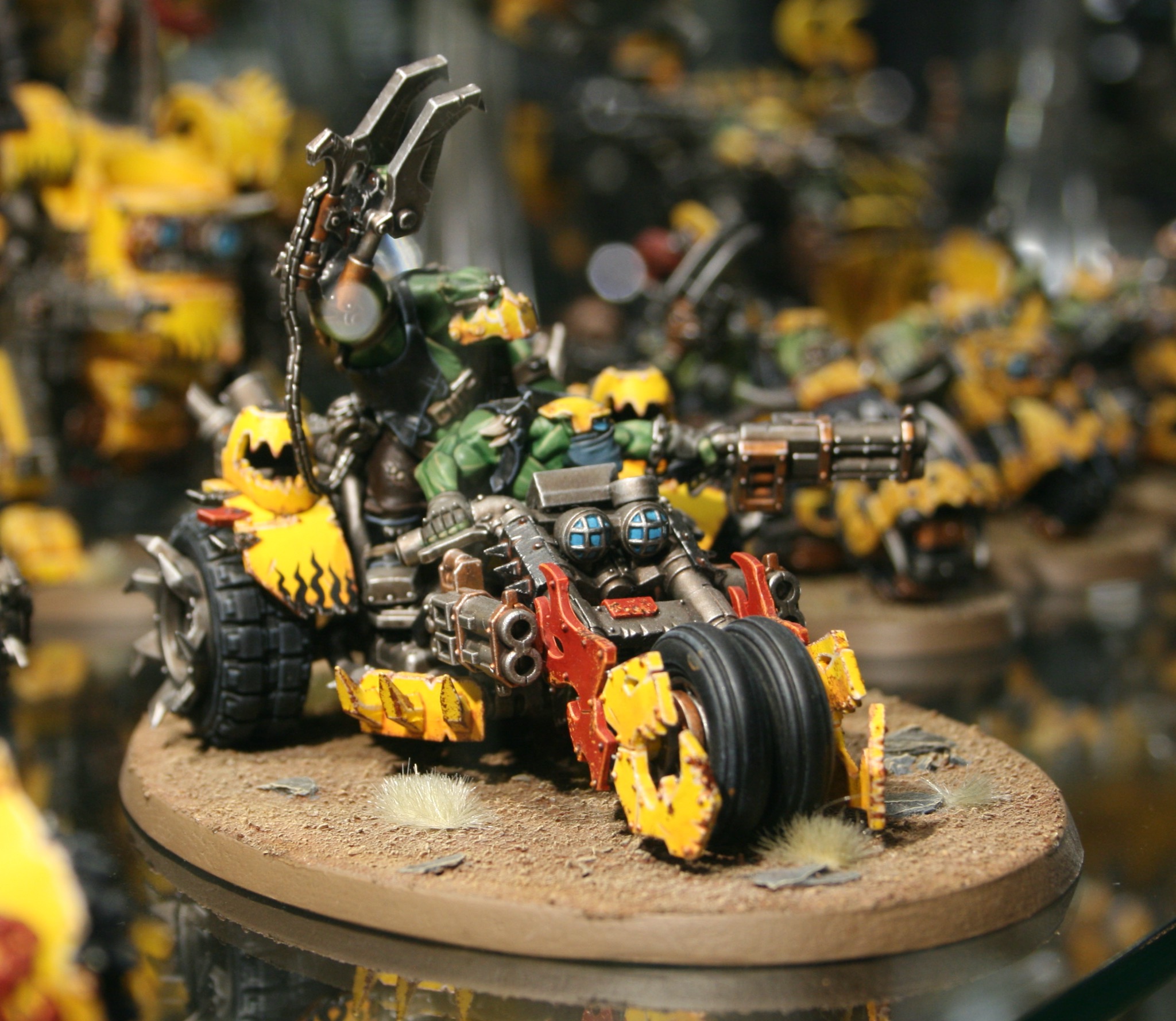 The Deffkilla Wartrike is one of the many different types of attack vehicles used by Orks across the known galaxy. What is lacks in armour, it makes up for in speed. Deadly scythes on the wheels can cause massive damage to all those who fail to get out of the way of this mean trike. Though the rokkit engine afterburner on the back means that they won’t have enough time to avoid the beast of a trike. The riders aren’t protected, but why worry, when you can just charge into the enemy forces.