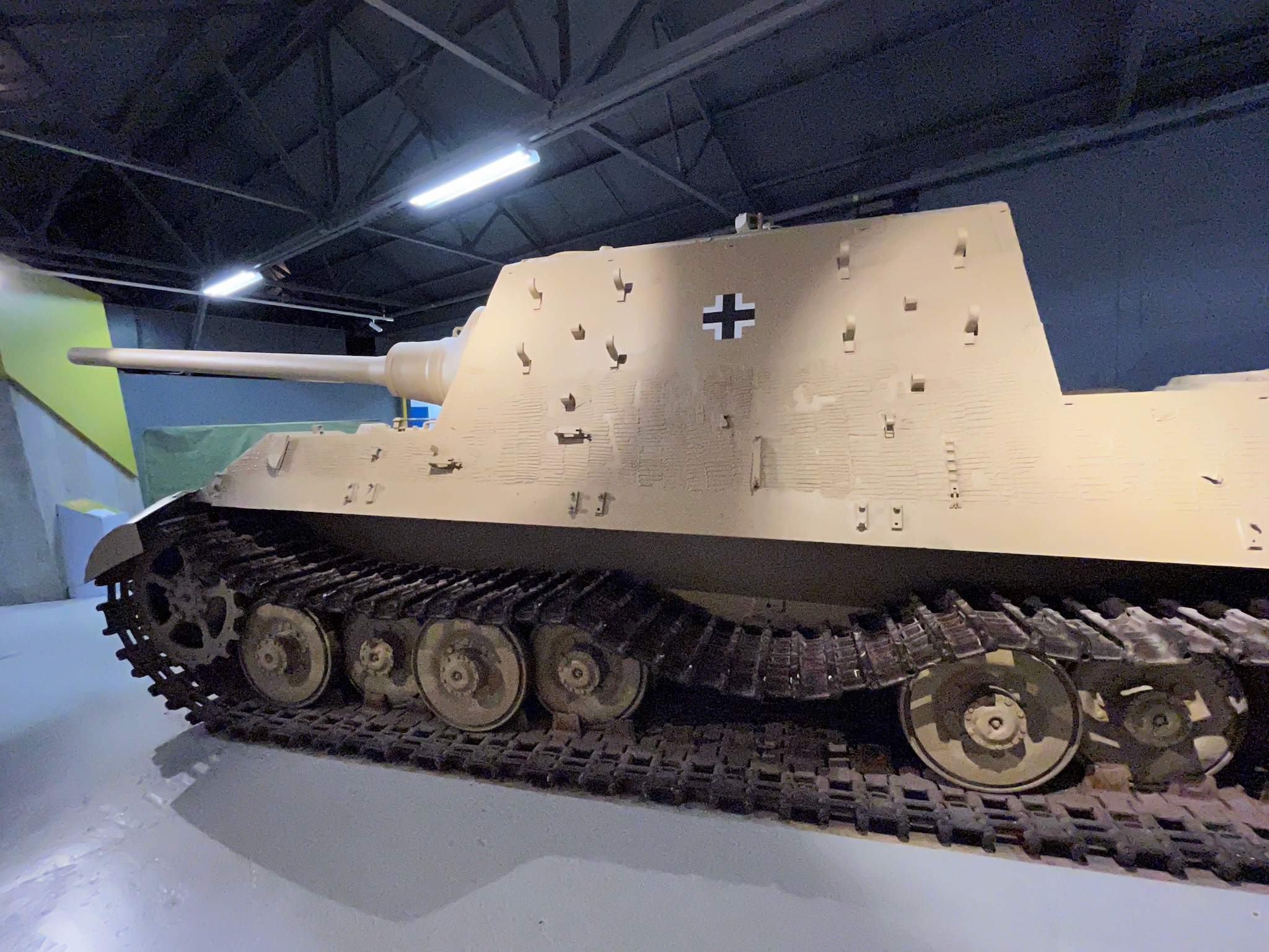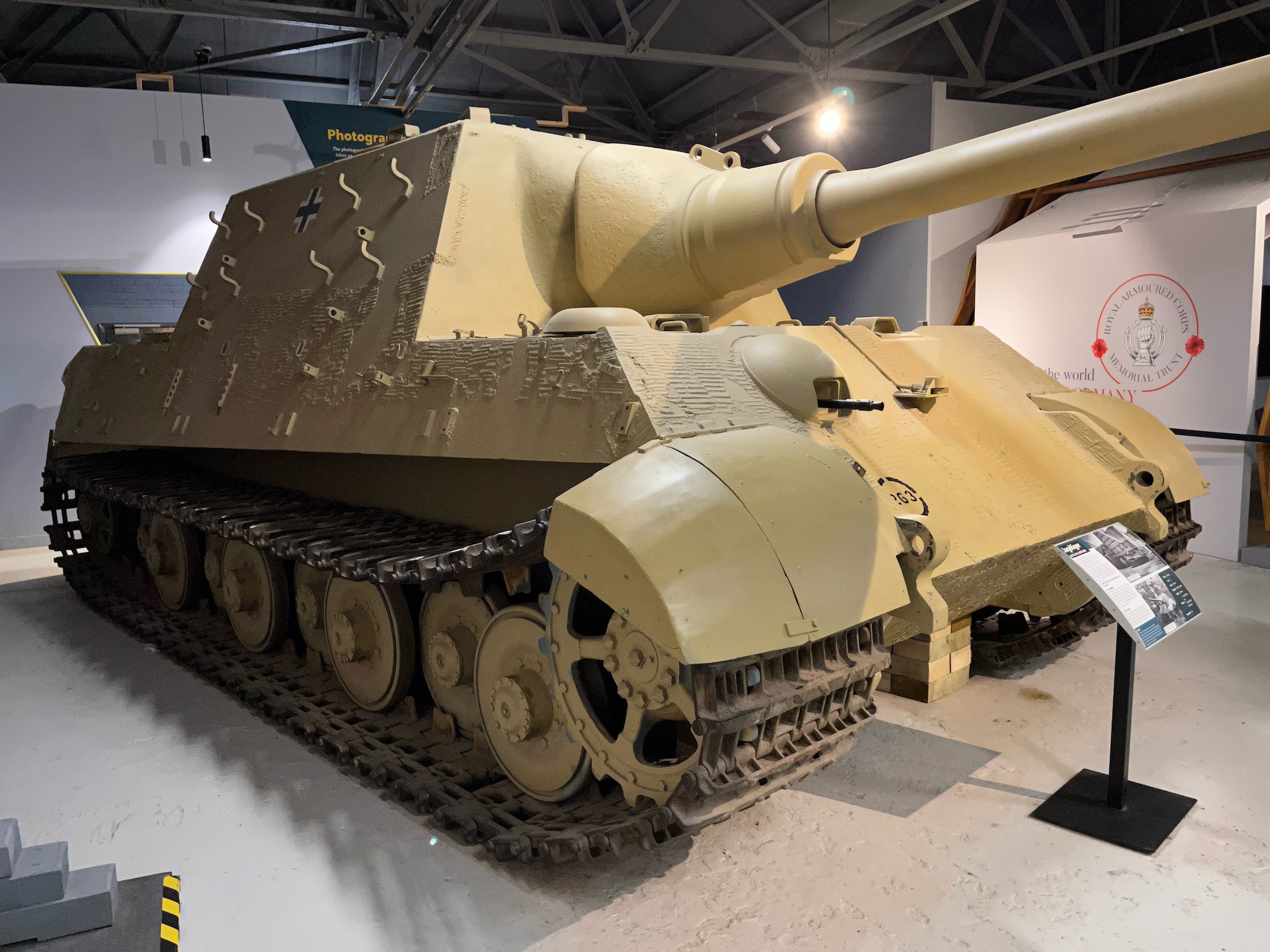 After being tested at Sennelager it was sent to the School of Tank Technology at Chertsey in the UK before arriving at the Tank Museum in 1952. It is missing its rear engine plate cover, its third suspension unit and two road wheels on its left hand side but still retains its original Zimmerit anti-magnetic mine paste.