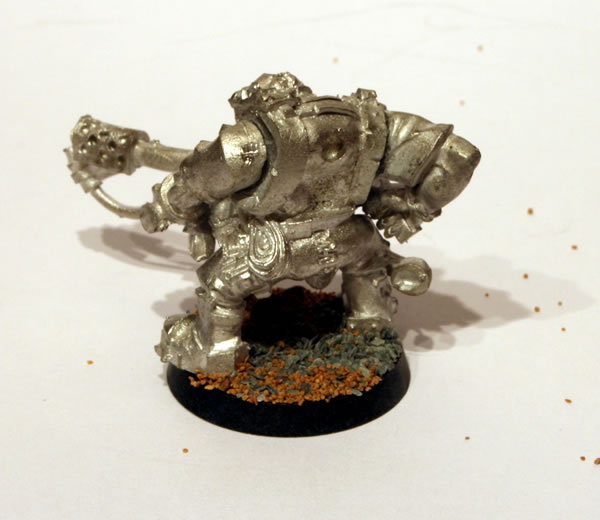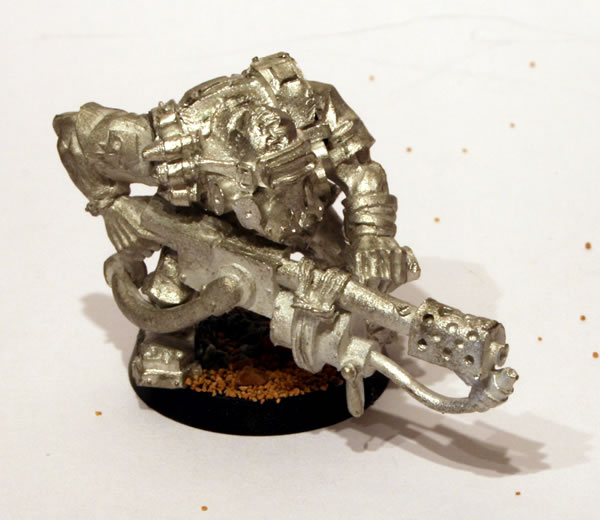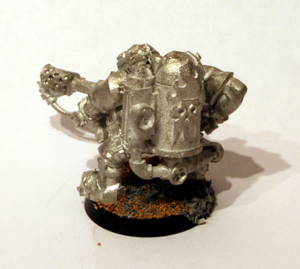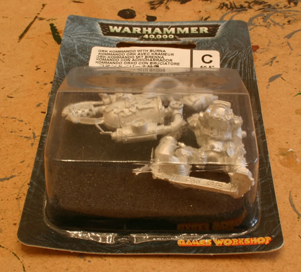 At GamesDay 2006 I purchased a box of Ork Kommandos. They were a release from Games Workshop as part of the Medusa V campaign. I also got a couple of Kommando with a Burna. This is a nice model. The Ork Kommando with Burna comes as two castings, which provides four components, the main body, a backpack and the two arms, one of which has the actual burna. I constructed the models and I added some slate and modelling sand to the base.