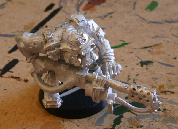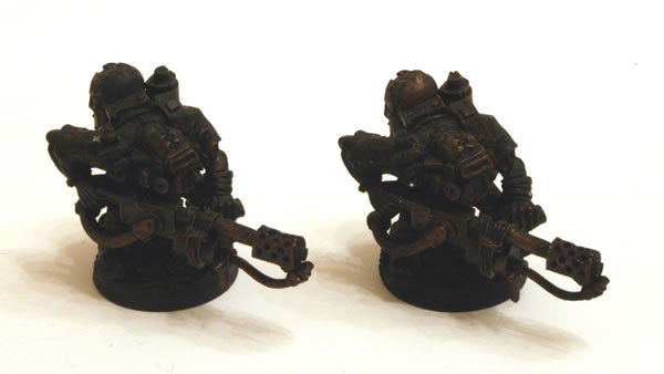 The next stage was to give the models a black undercoat, where the black spray has “missed” areas this was touched up with thinned down Chaos Black paint. Having given the models a black undercoat, they were drybrushed with Tin Bitz.
