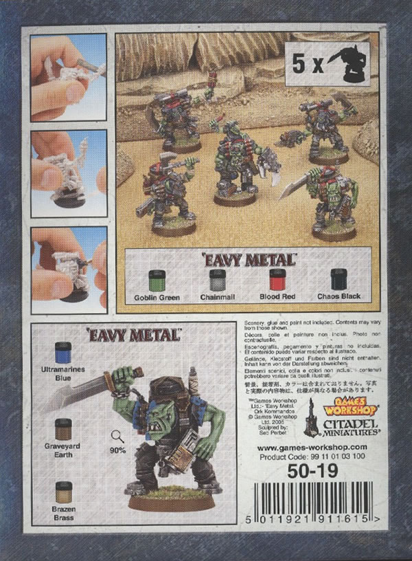 At GamesDay 2006 I purchased a box of Ork Kommandos. The Orks came in quite a few components, and each as their own backpack, with the Nob backpack also having a Grot hiding in the top. I based the models using a basing kit.