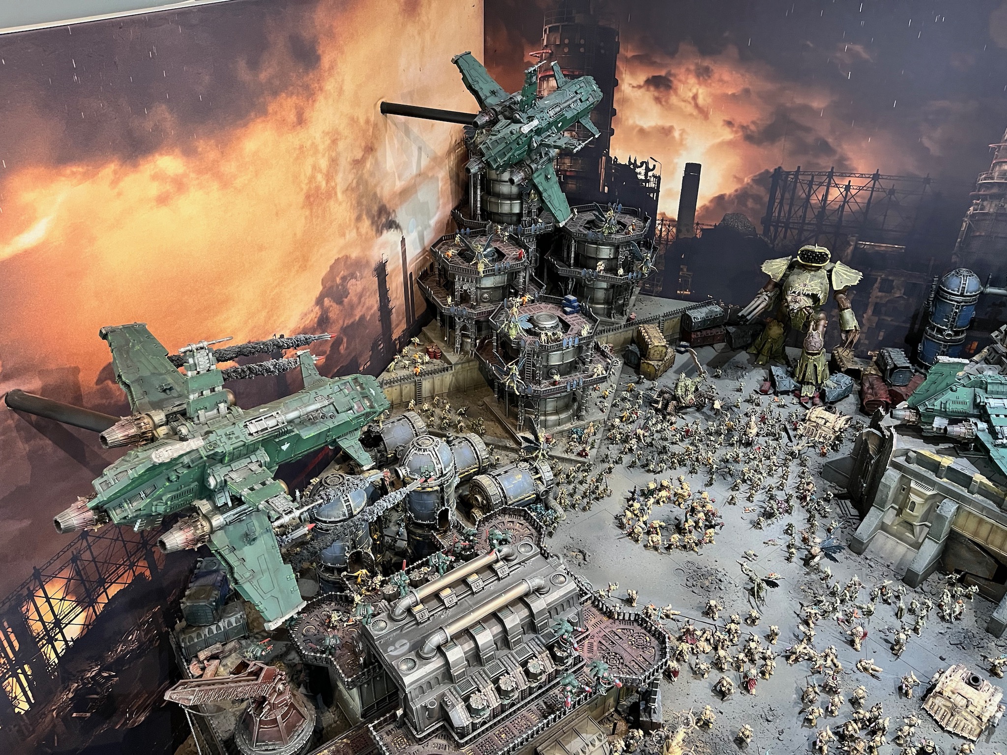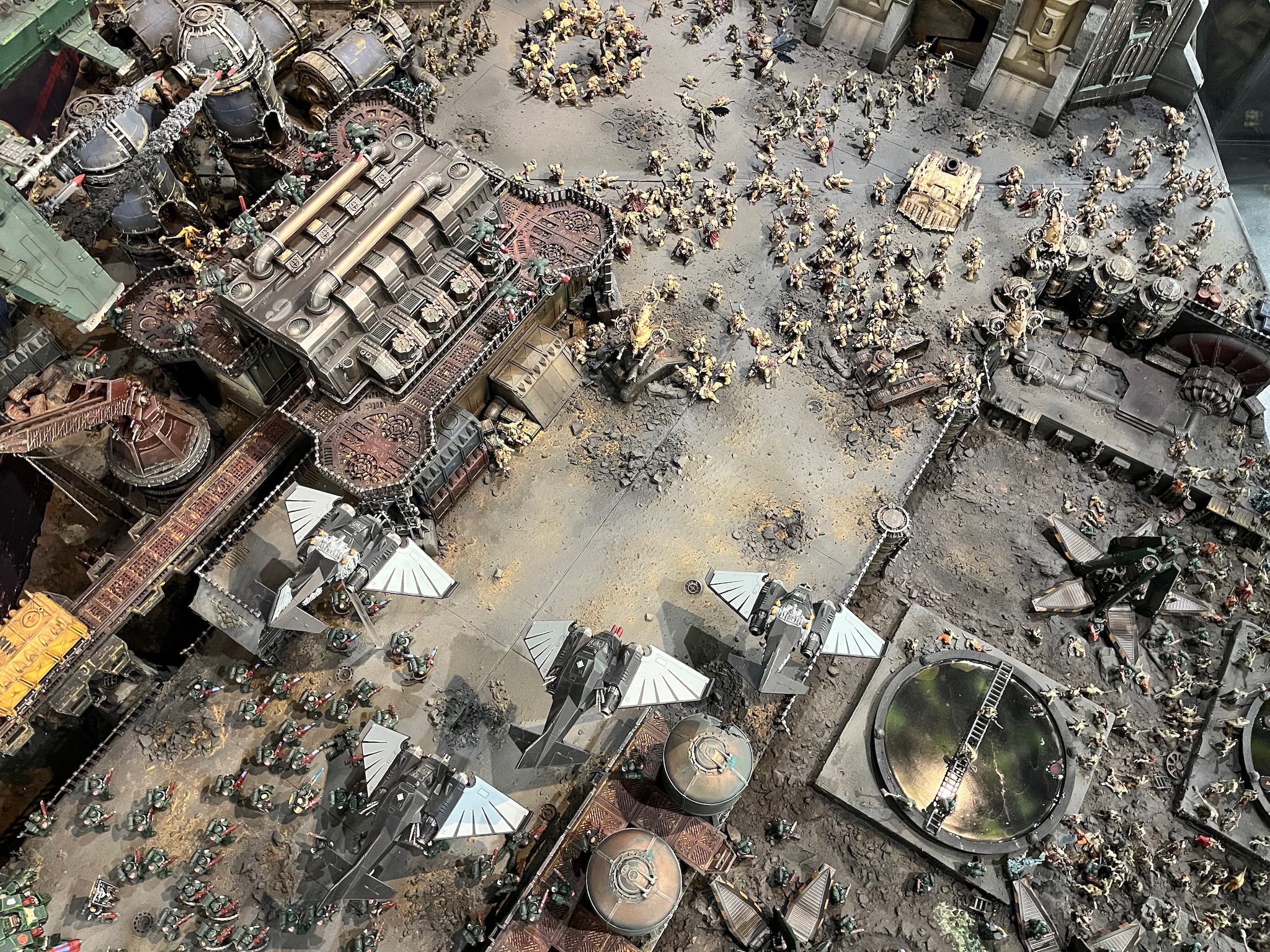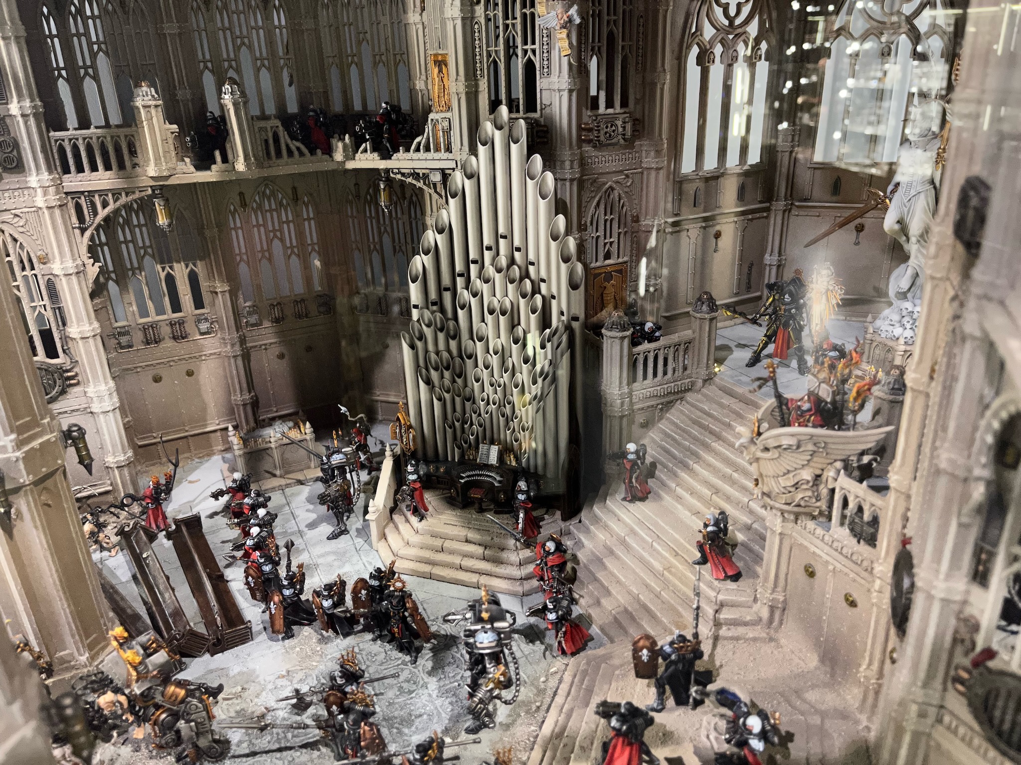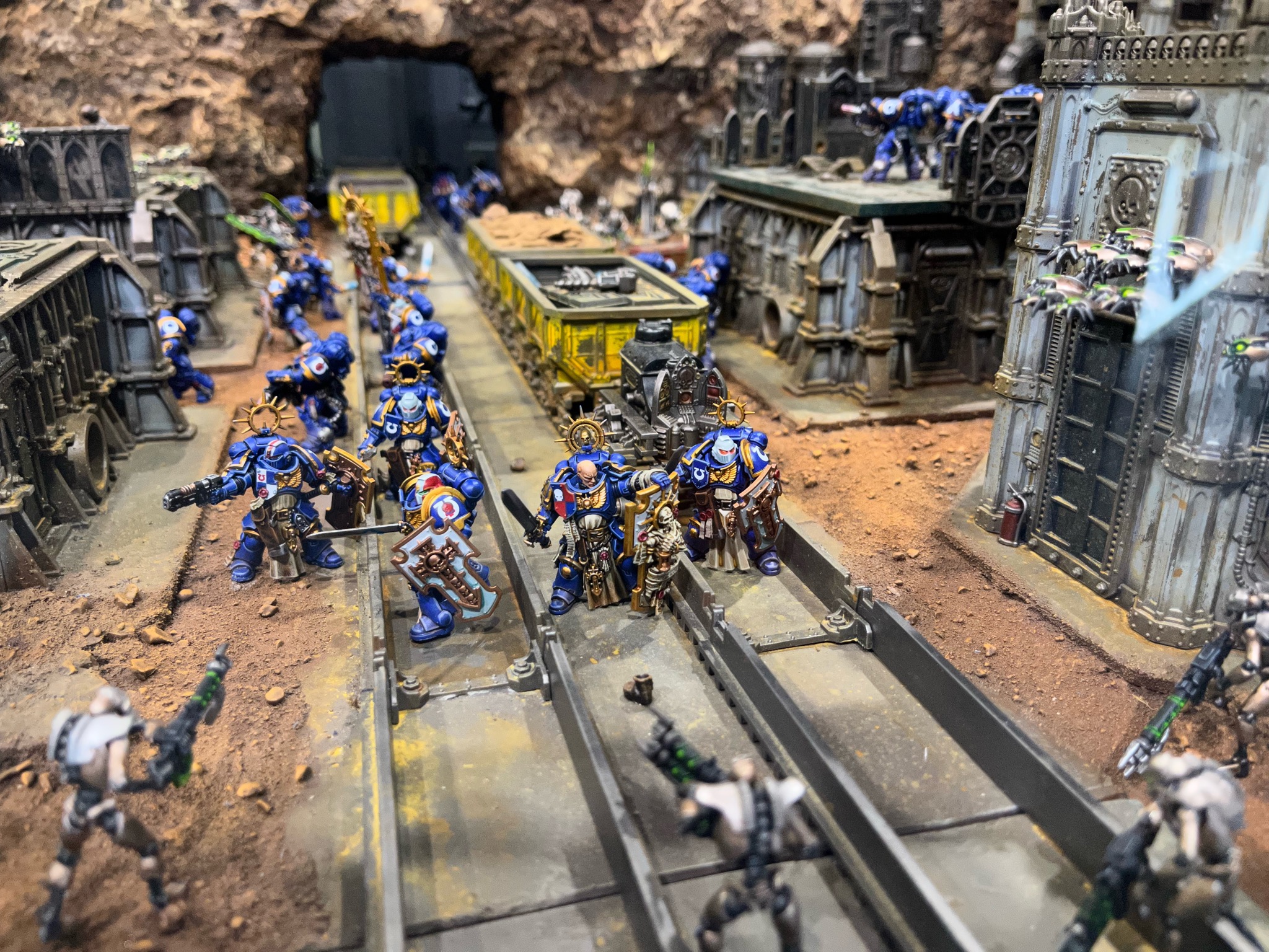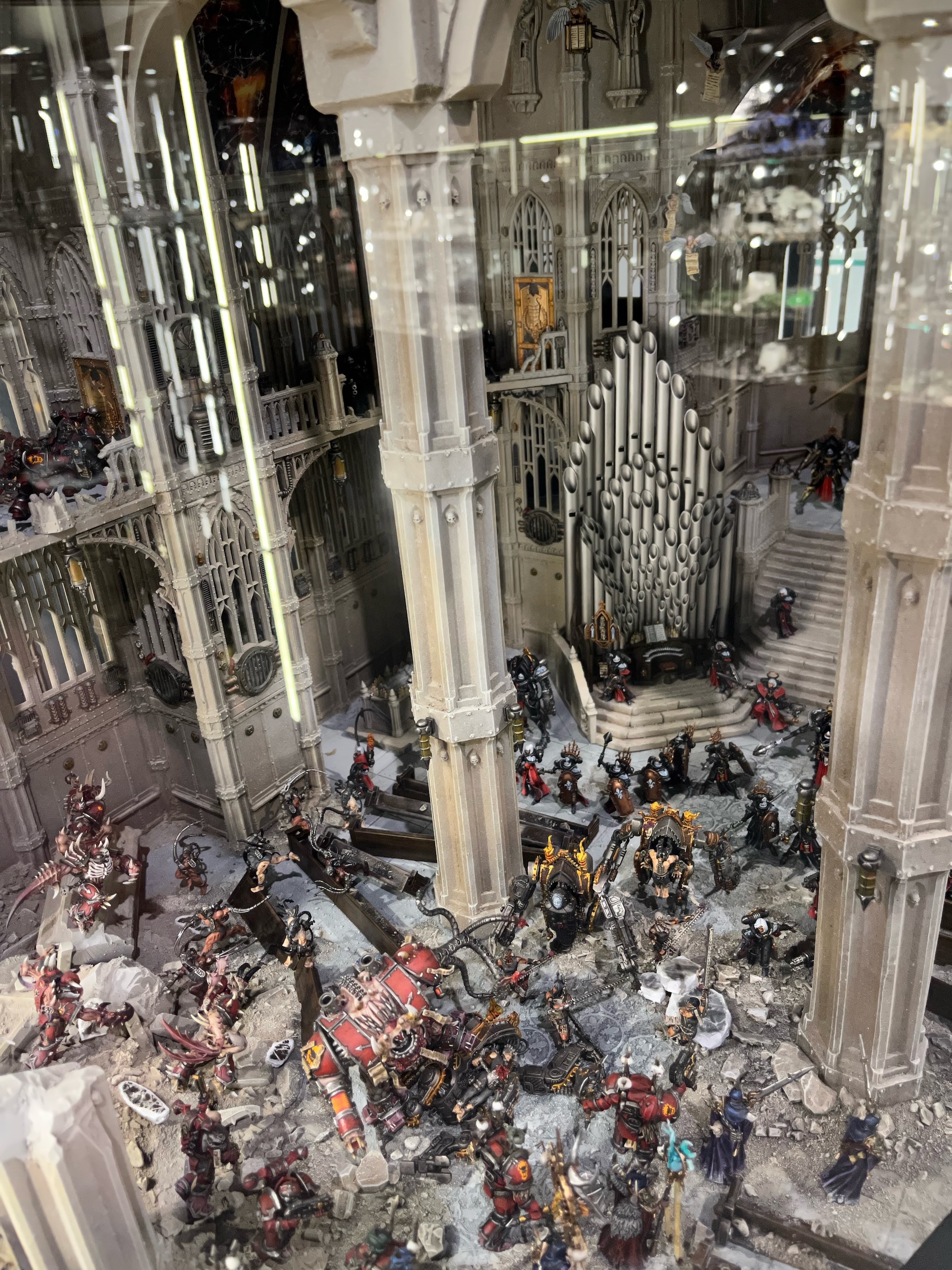 In the entrance hall of Warhammer World is a large diorama of Ultramarines defending an Imperial facility against an overwhelming Necron force, entitled the Mines of Vertigus II.
