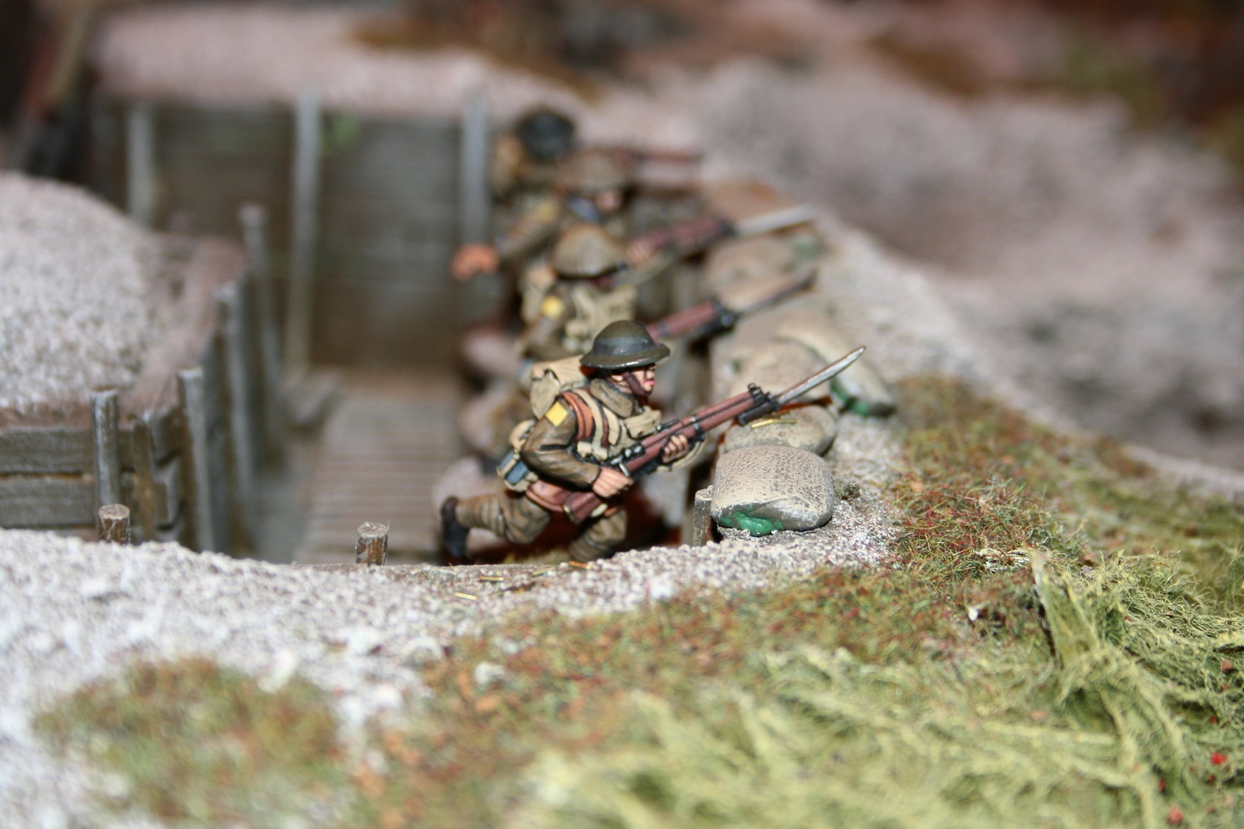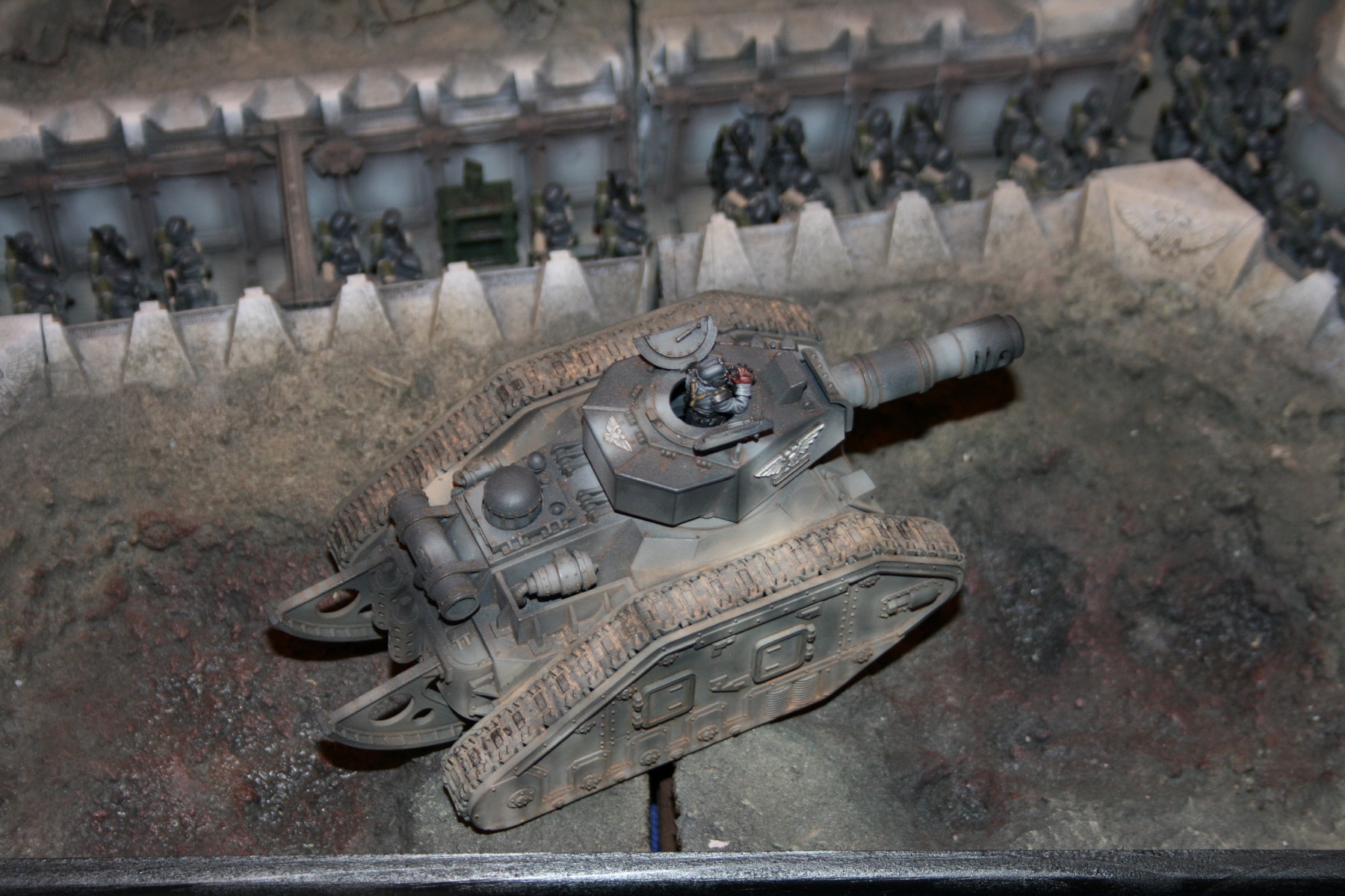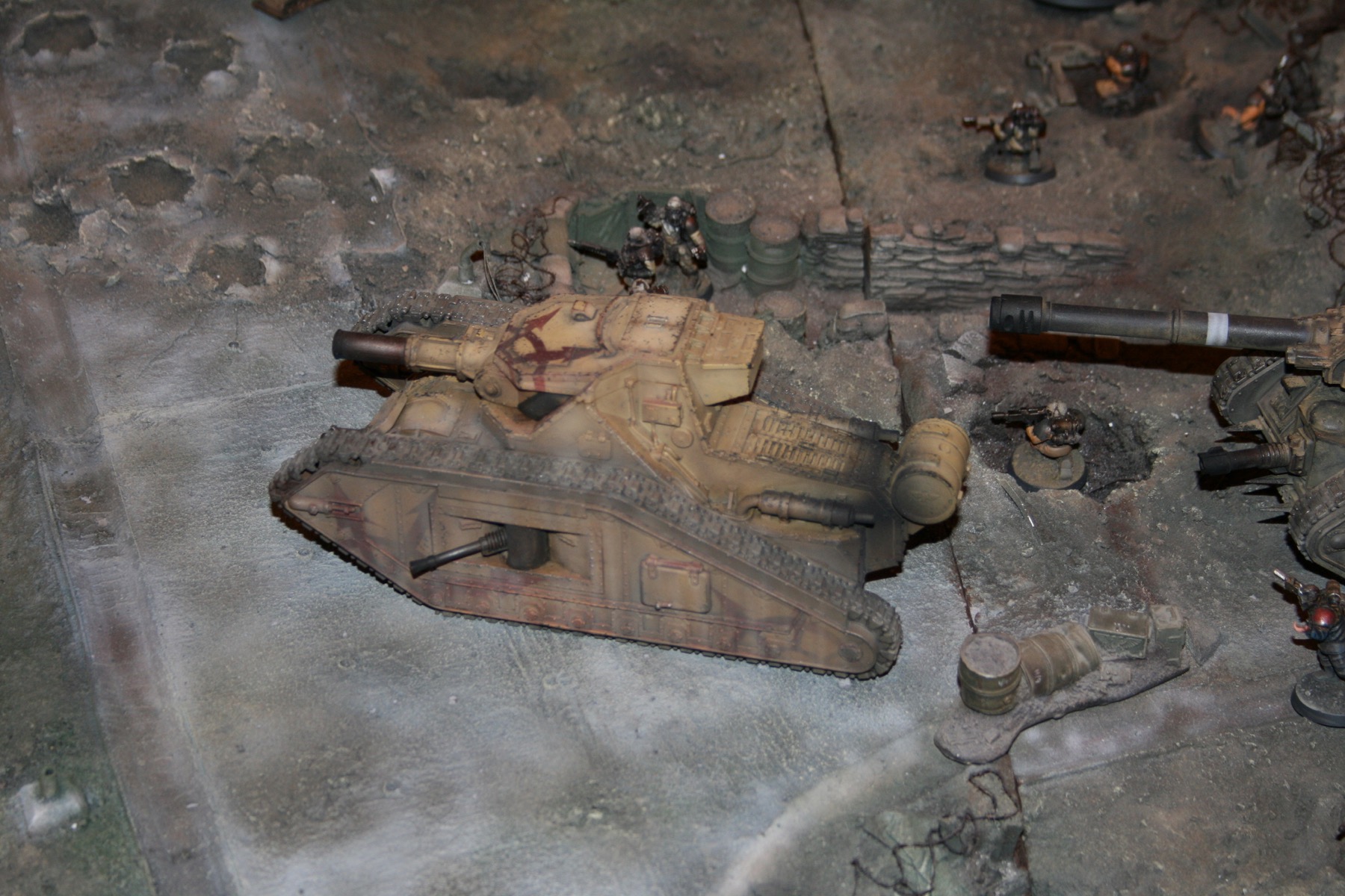 Imperial Guard Leman Russ with Modified Ryza Pattern Annihilator Turret moves forward across a trench system during the Siege of Vraks. From the Forgeworld Siege of Vraks diorama at GamesDay 2007.