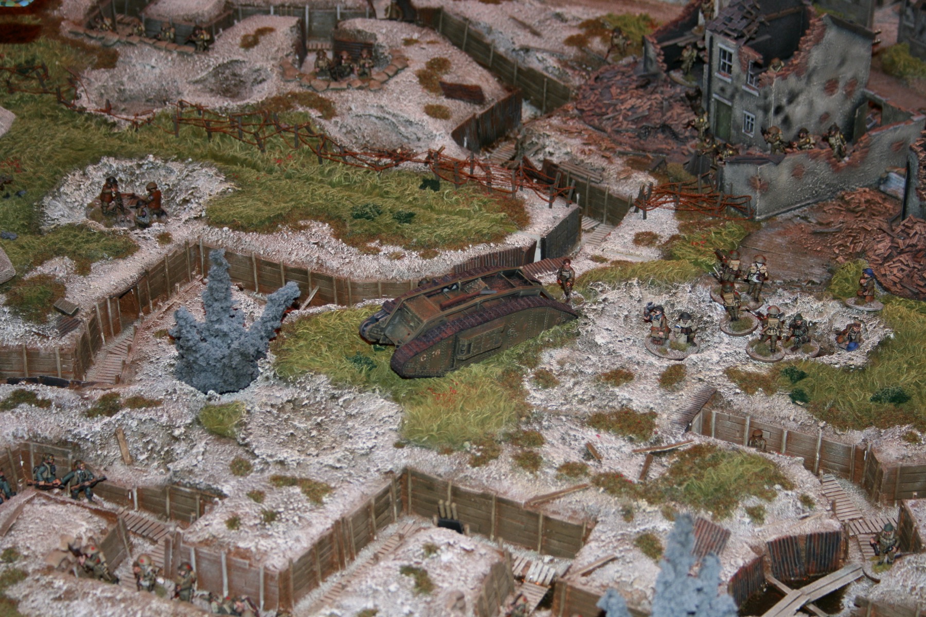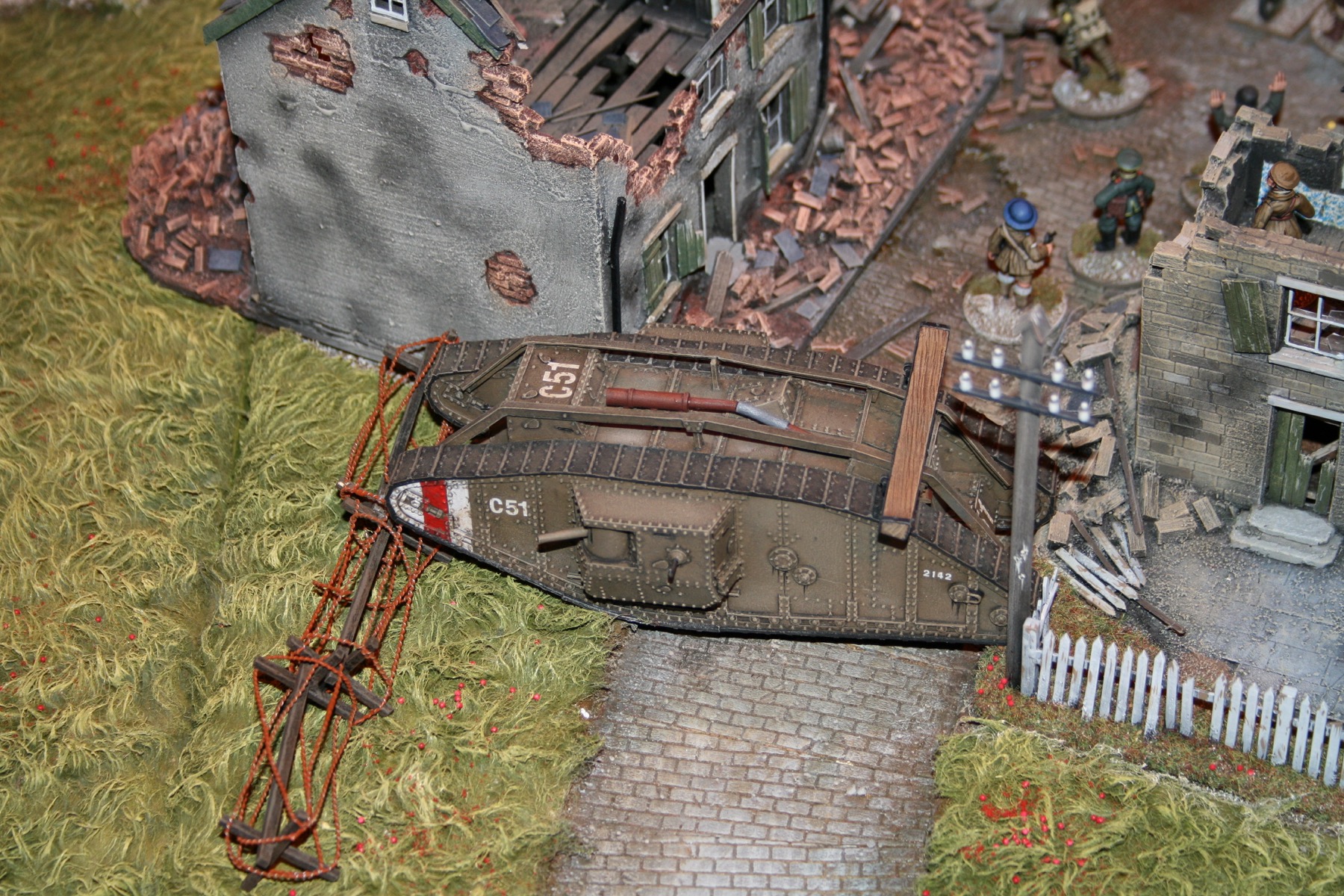 Mk IV Tank Male slowly trundles forward crushing the barbed wire obstacles in its path.