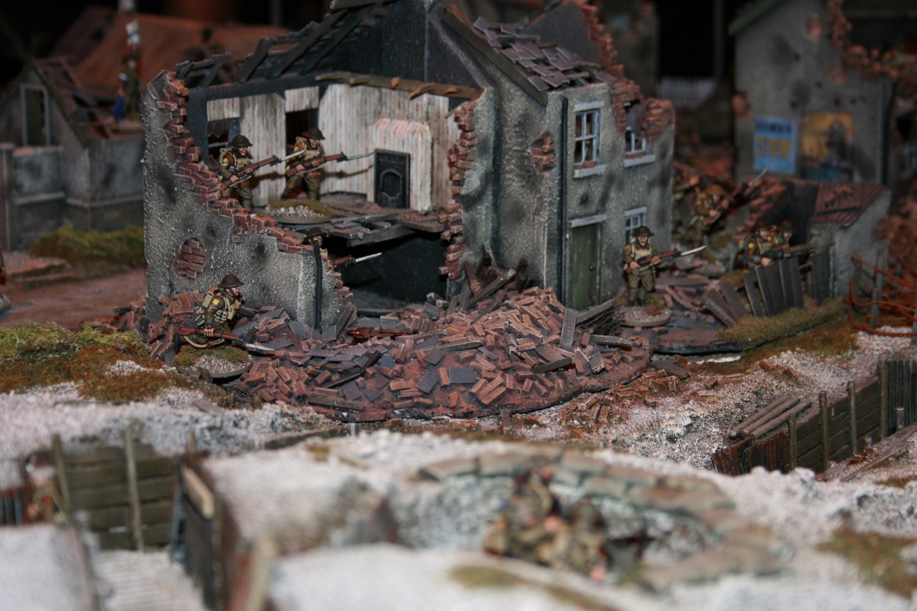 British Infantry advance through the ruins of a French village.
