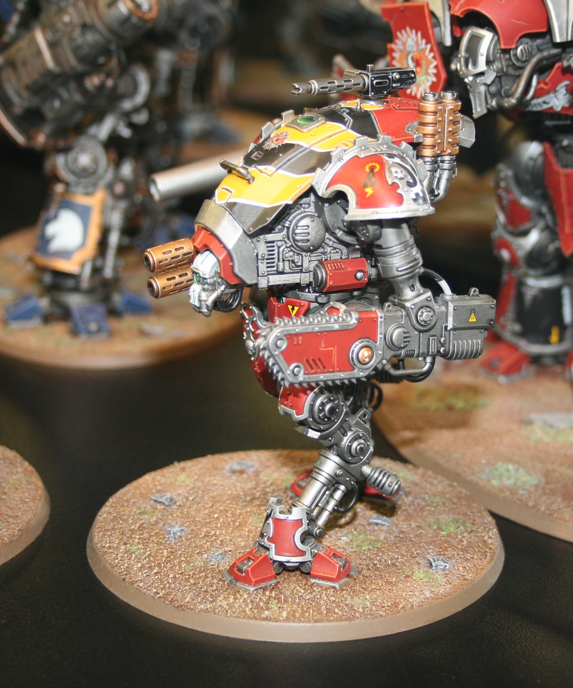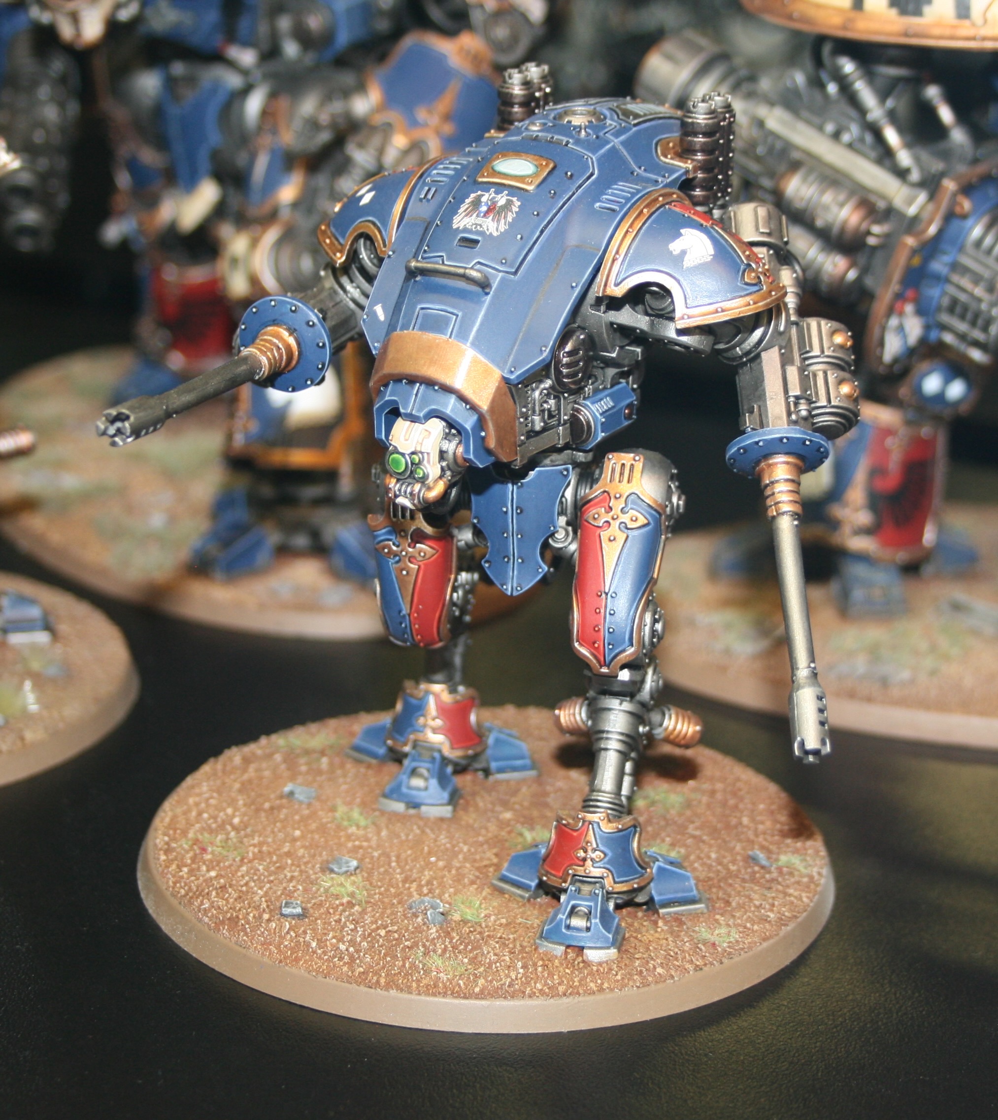 I do like the concept of the Imperial Knights and looking over the range of models I did think that the Armiger Warglaive could be the basis of a Grey Knight version, complete with protective purity seals, additonal sheilds, even a new head, etc…