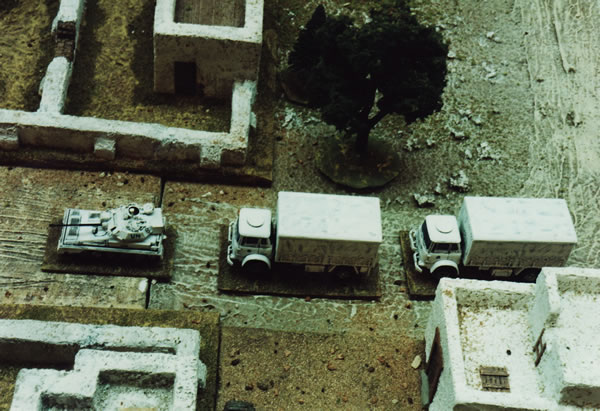 A Royalist convoy, with Laird Centaur Half Tracks is approaching Gloucester when it is ambushed by a force of Democratic Guards using light scout vehicles, motorbikes and a single Armoured Laird Centaur Half Track.