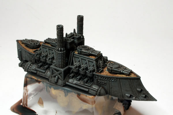 As with the frigates and the cruisers I gave the Ruler Class Battleship from the Dystopian Wars Kingdom of Britannia, a wash of Citadel Shade: Agrax Earthshade. I did this to add shadow and shade and emphasise the decking.