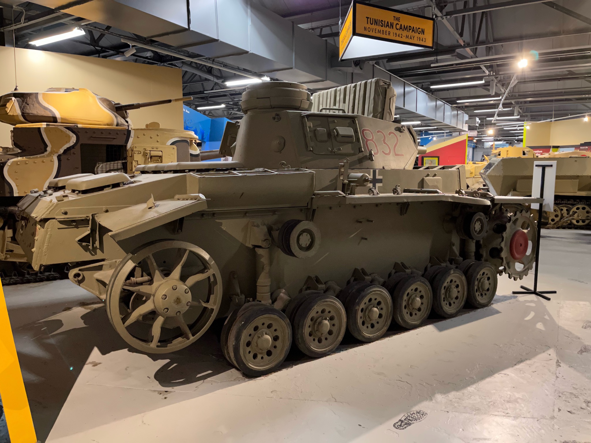 This tank, which was part of 8. Kompanie, Panzer Regiment 7, had tactical number 832 painted on its turret. It was abandoned at Kzar Mezouar, during Operation Ochsenkopf, also known as the battle of the Hunt’s Gap, in late February, 1943. It was then shipped to the United Kingdom for evaluation and later sectioned to show its interior.