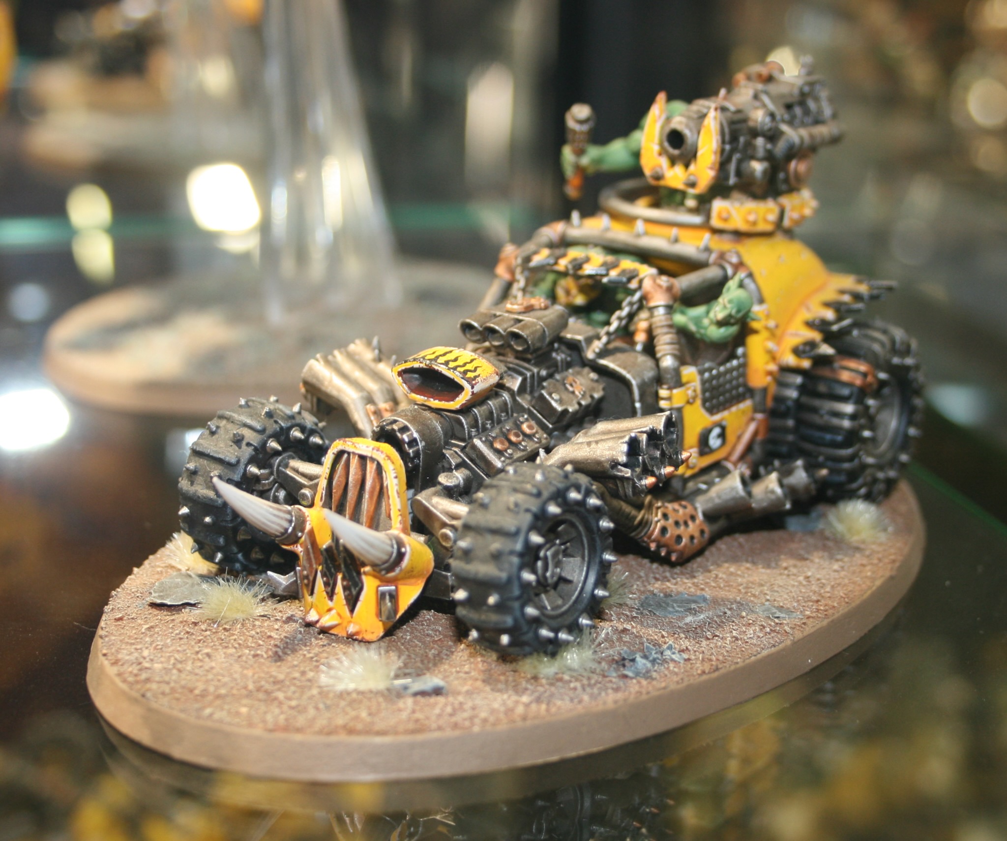 Born from the greasy ingenuity of Snakebite Orks with a canny eye for battlefield economics, the Rukkatrukk Squigbuggy wasn’t initially conceived as a weapon of war, but rather a mobile snack bar for the speed-addicted Speed Freeks. Imagine ramshackle, rattling pens on wheels, teeming with edible squigs, keeping pace with the thunderous advance of Warbikers, buggies, and Trukks. Above the din of engines, the Squigbuggy crews, all toothy grins and booming voices, would hawk their squirming wares.