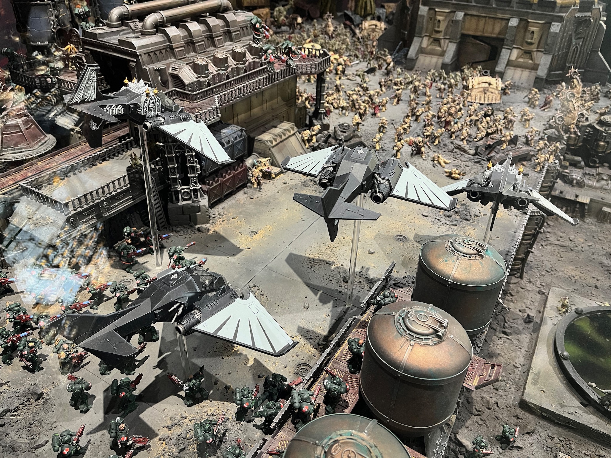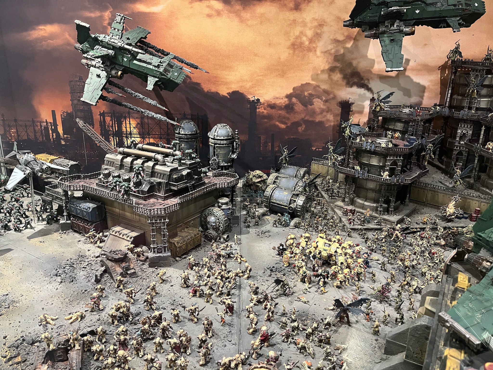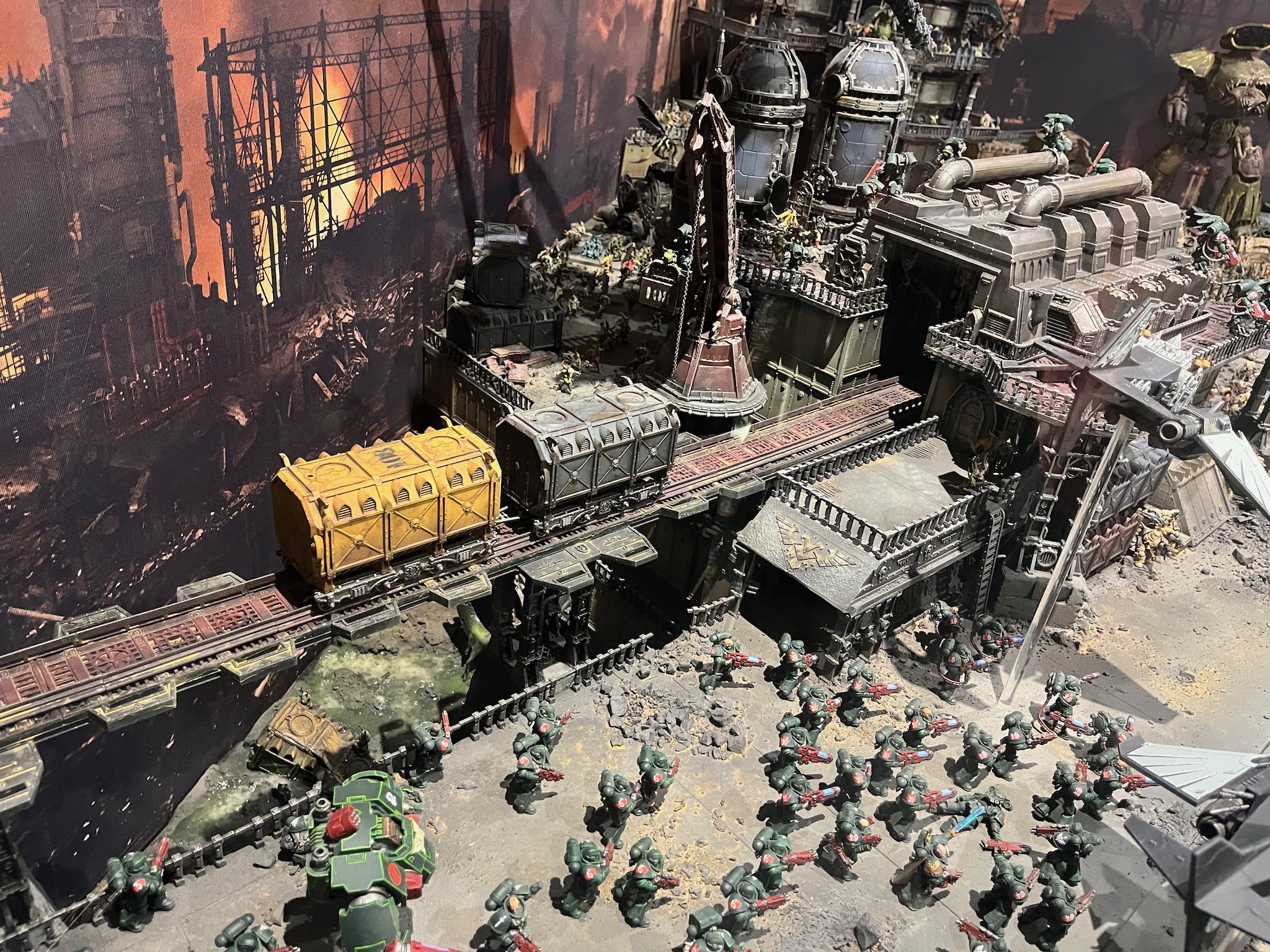 In this diorama at Warhammer World the Dark Angels are fighting to reclaim the industrial world of Khendrel IV from the clutches of the Death Guard.