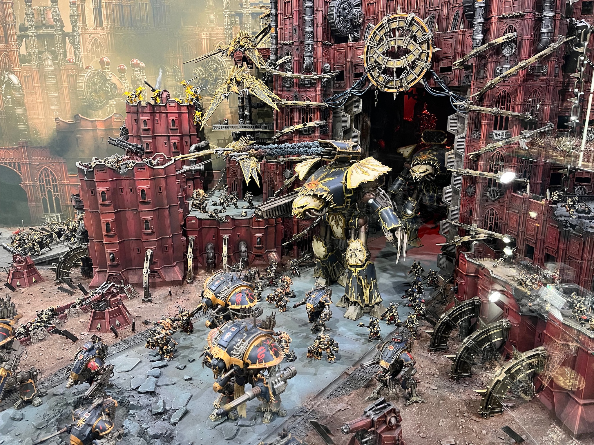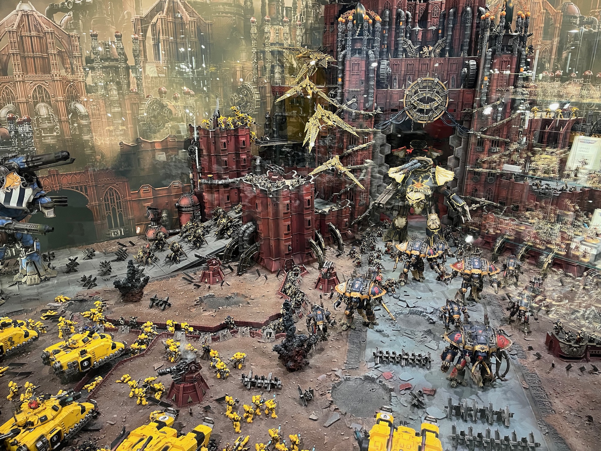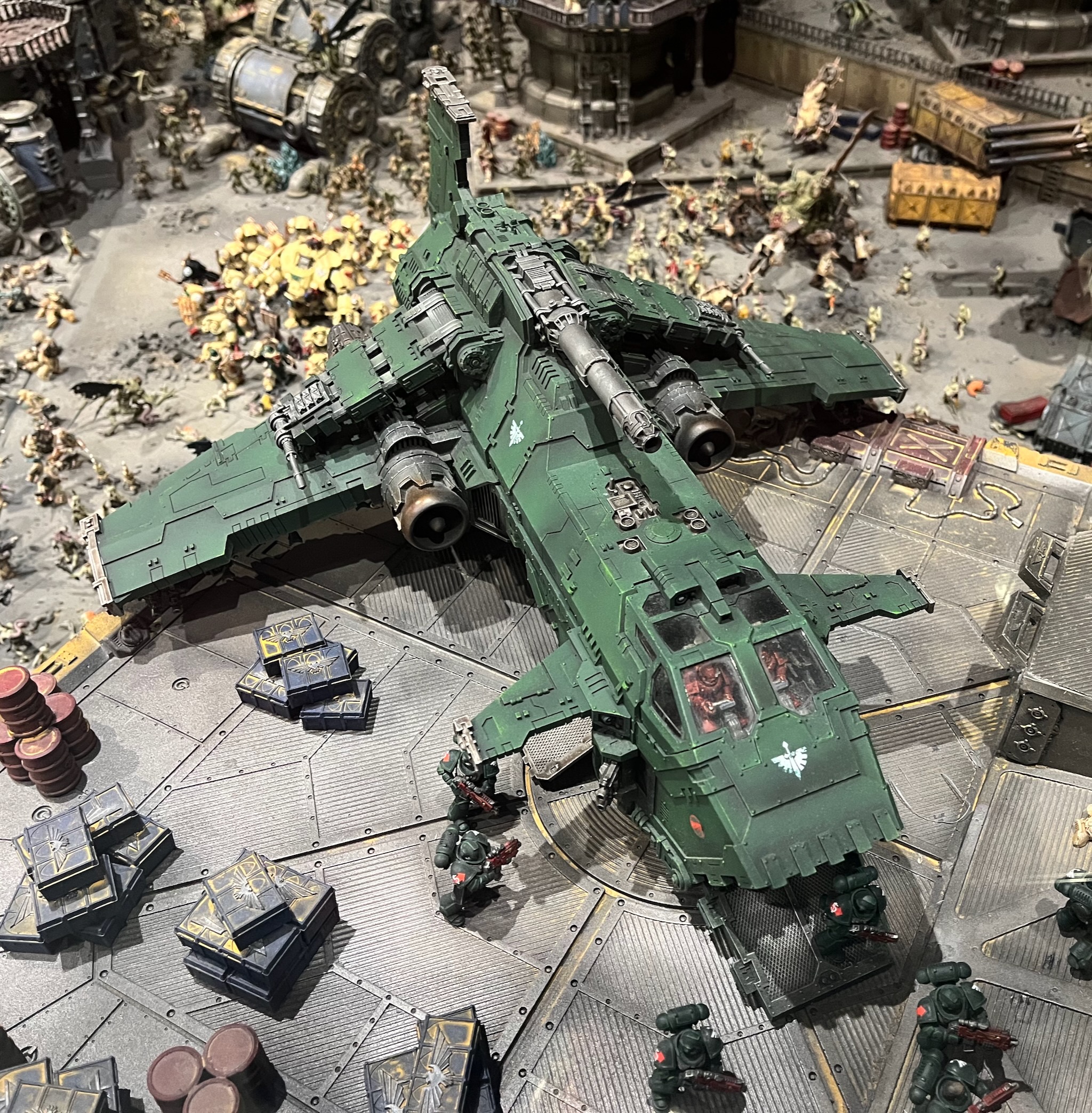 In this diorama at Warhammer World the Dark Angels are fighting to reclaim the industrial world of Khendrel IV from the clutches of the Death Guard.