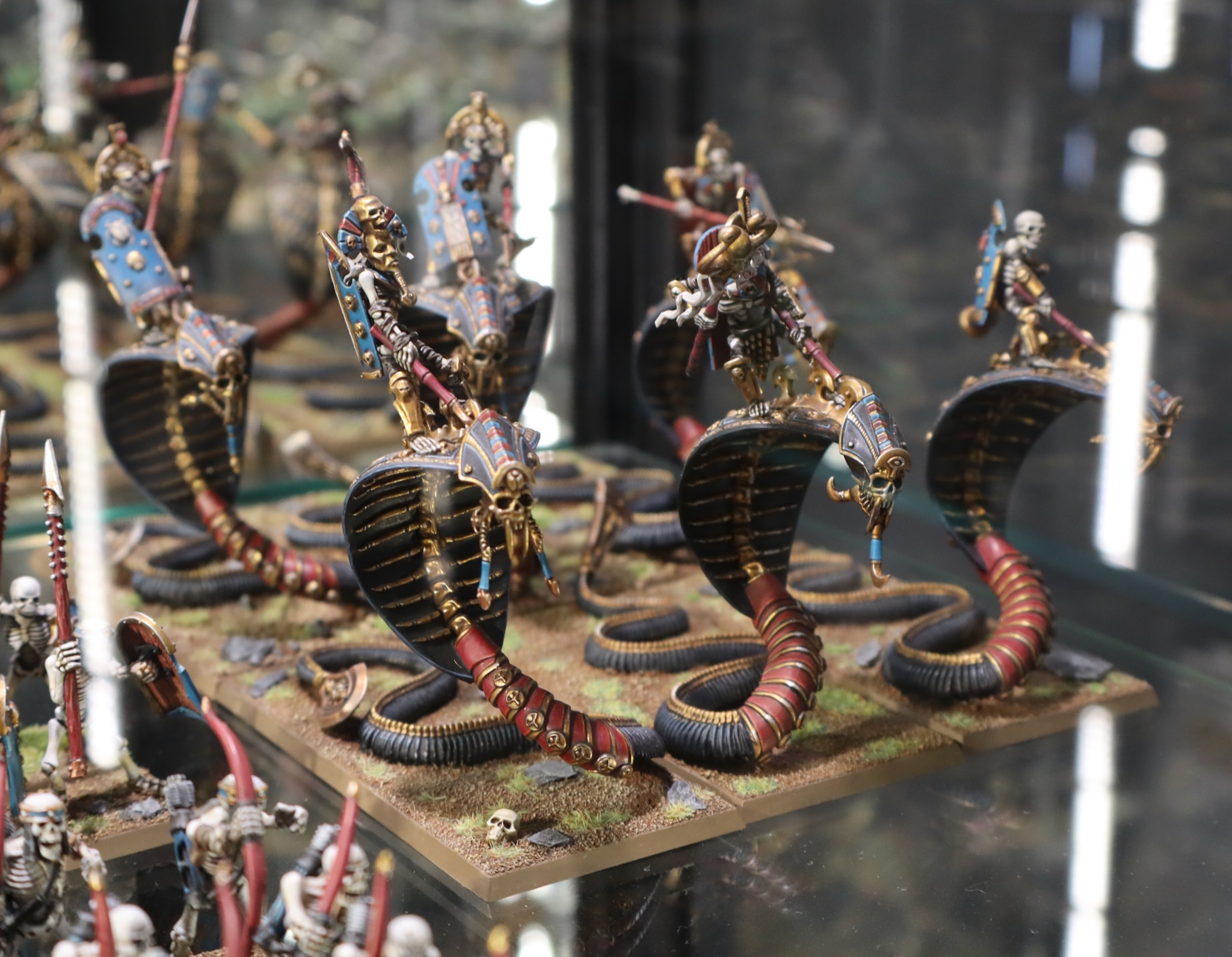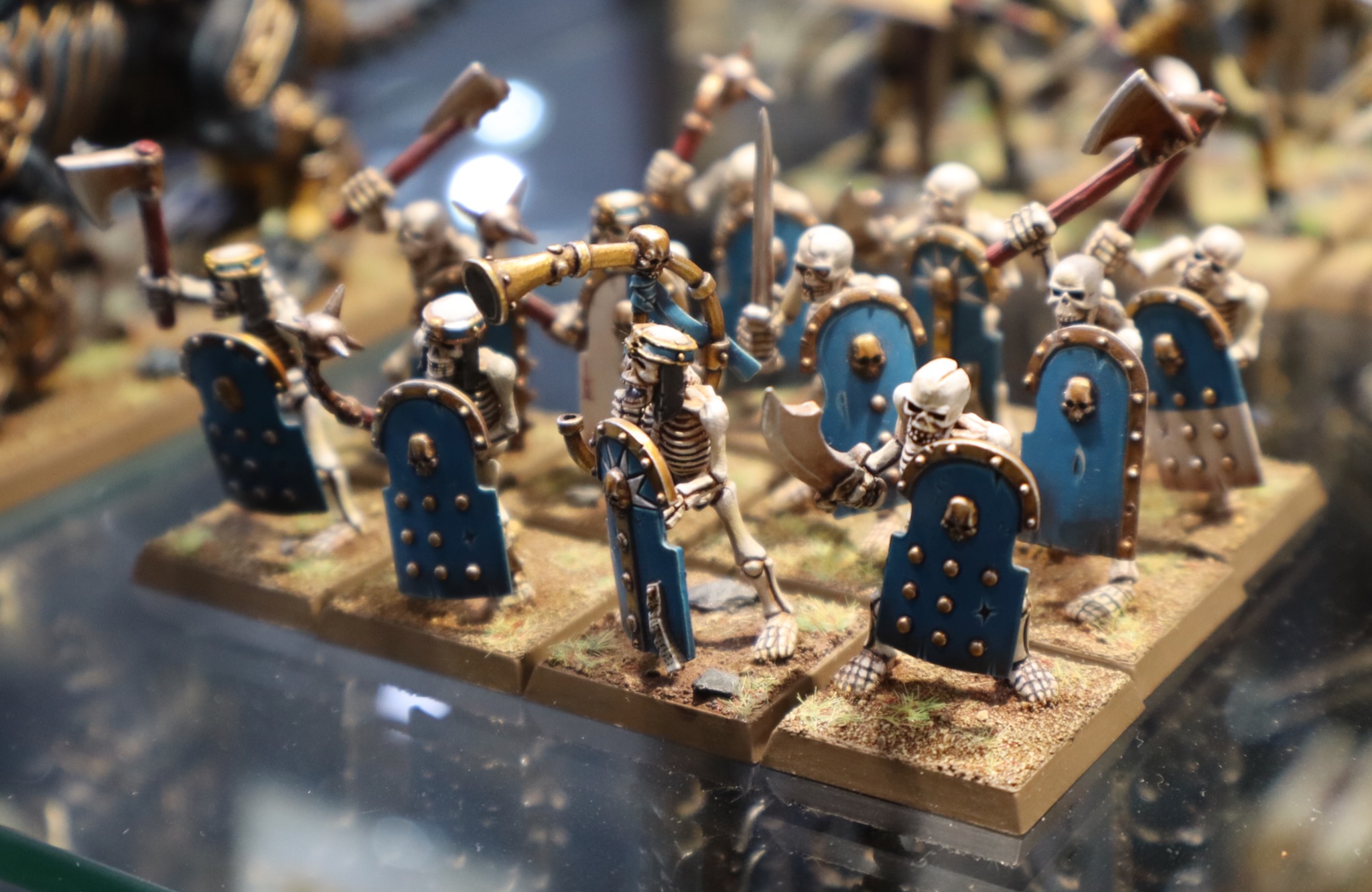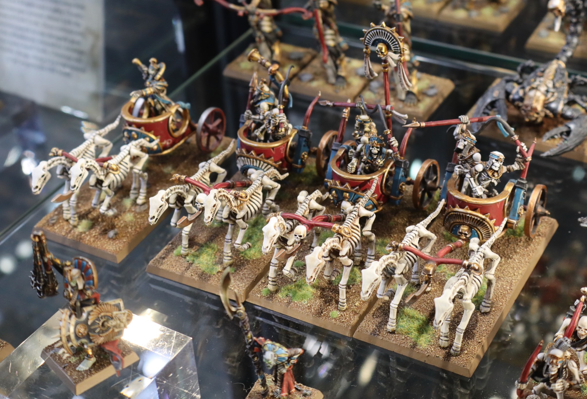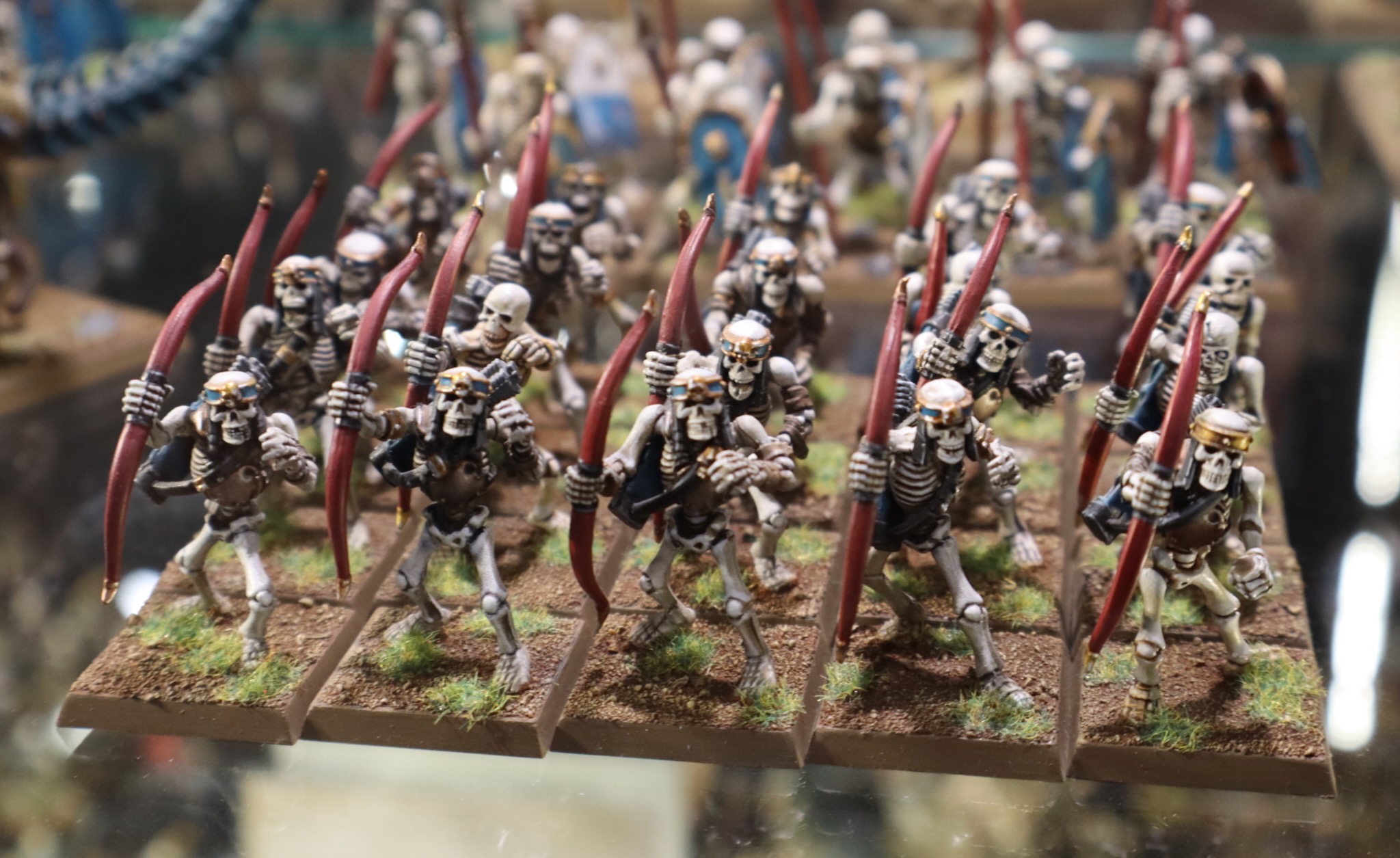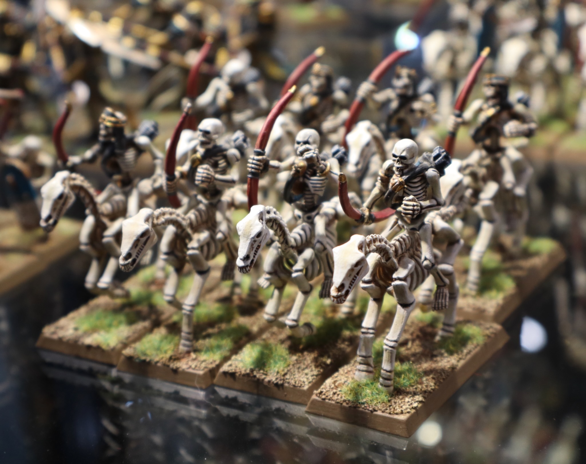 The rank and file of a Tomb Kings army consist of Skeleton Warriors and Skeleton Archers, seemingly endless hordes of reanimated soldiers from millennia past. While individually weak, their strength lies in their numbers and their terrifying resilience. Being undead, they are immune to psychology and cannot be broken by fear or casualties, simply crumbling away if too much damage is inflicted upon them. This allows them to form unyielding battle lines, holding back even the most ferocious charges through sheer weight of numbers. Supporting these infantry masses are the swift Skeleton Horsemen and Skeleton Horse Archers, providing mobile flanking forces or harassing fire. The thundering charges of Skeleton Chariots, crewed by skeletal warriors or even the elite Tomb Guard, deliver powerful impact hits and sow chaos in enemy ranks.
